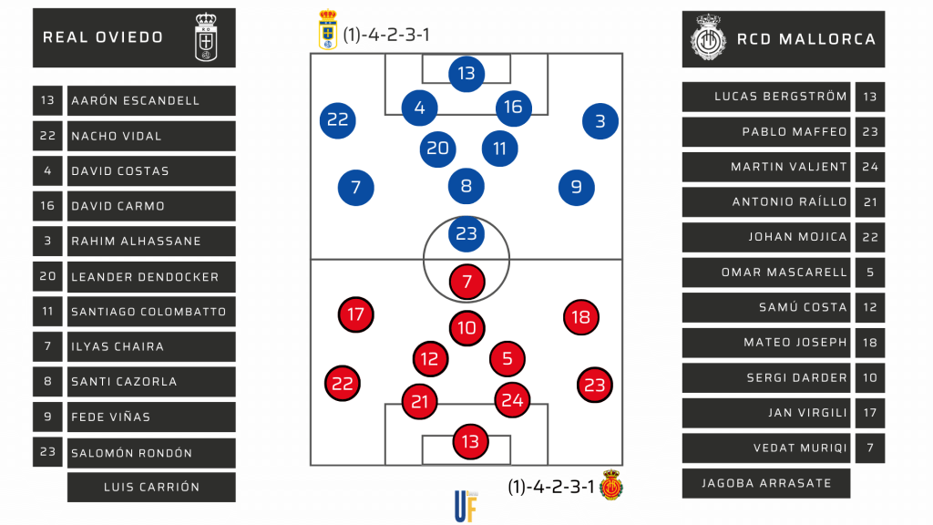 Real Oviedo: Aarón Escandell; Nacho Vidal, David Costas, David Carmo, Rahim Alhassane; Leander Dendocker, Santiago Colombatto; Ilyas Chaira, Santi Cazorla, Fede Viñas; y Salomón Rondón.